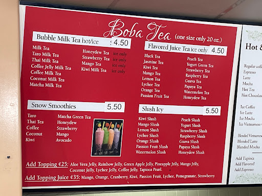 Don't miss the cafe's selection of refreshing drinks, like the smooth Berry Sunrise Smoothie or the indulgent Oreo Blast Smoothie. For a bit of energy, the Iced Vietnamese Coffee or the Blended Vietnamese Coffee is a must-try.